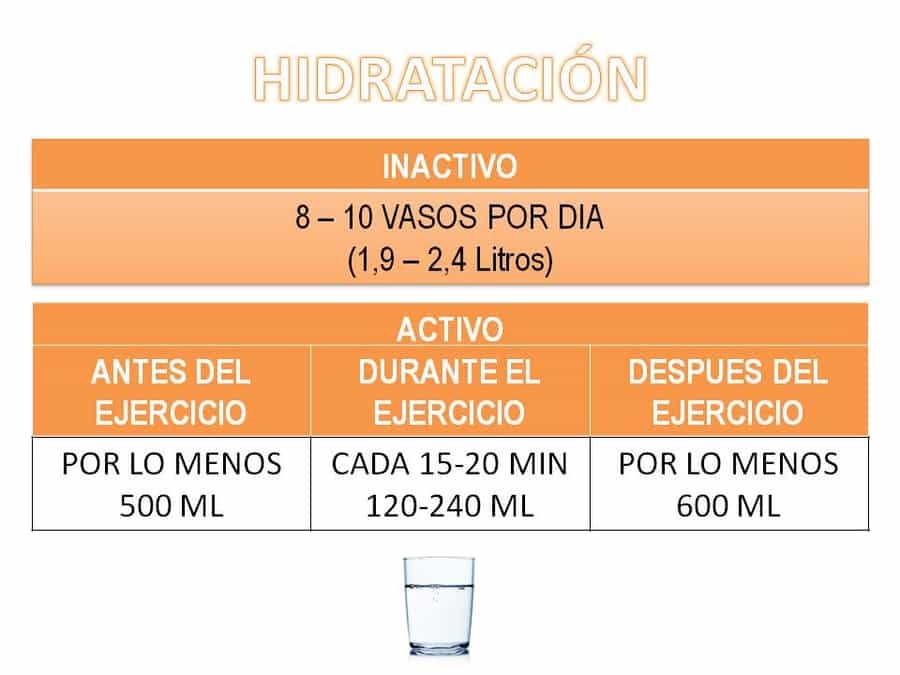 Cada 1000 kcal consumidas es necesario ingerir 1 litro de líquido o bien 1 ml por Kcal consumida al día. Es importante también que el líquido sea ingerido y distribuido durante todo el día, o bien antes, durante y después del ejercicio. De otro modo, el agua no alcanza a ser absorbida a nivel celular. Es por eso que este comportamiento debe convertirse en un hábito y debe ser realizado en conjunto con el entrenamiento deportivo. Dado que el agua es un componente tan importante para nuestra fisiología, debemos tener en cuenta tanto la cantidad como la calidad del agua que tomamos en cada sesión deportiva.