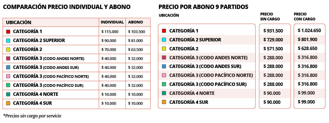 La venta será a través Puntoticket, y los precios de los abonos van desde los $99.000 en la categoría 4 Sur hasta el $1.024.650 del abono categoría 1. Así que para el que quiere asegurarse, la recomendación es despertarse bien temprano, y comprar rápido antes que se agoten. Y para los que ya pensaban gastarse todo el aguinaldo y más para celebrar este 18, tienen esta noche para meditar con la almohada si están dispuestos a sacrificar parte del presupuesto dieciochero por ver jugar a los campeones de América.