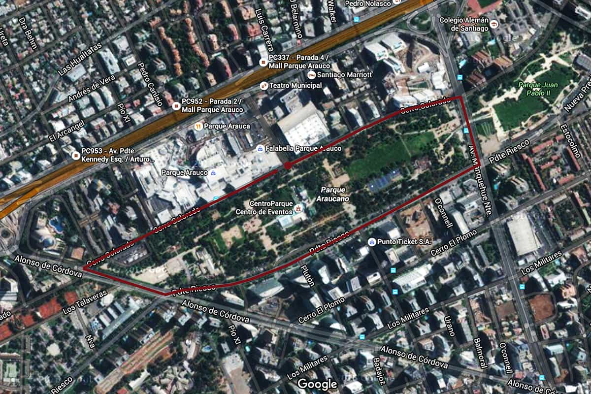 Probé las dos rutas del Parque Araucano y prefiero entrenar en la periferia del parque, partiendo por la salida del parque hacia el Mall Parque Arauco. Cero Colorado, después tomo Av. Manquehue Norte, doblo en Presidente Riesco y sigo hasta Av. Alonso de Córdova para reencontrarme con Cerro Colorado y así terminar con la ruta completa.