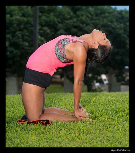 8.- Postura del camello: para lograr esta postura primero debemos hincarnos en nuestra esterilla, con la espalda recta y los brazos a los lados, y con los pies estirados, de tal manera que el talón sobresalga. Luego debemos comenzar por levantar nuestros brazos por sobre nuestra cabeza y comenzar a descender hacia atrás, hasta que nuestras palmas toquen los talones. Para mantener el equilibrio, dejamos nuestras manos apoyadas en los talones o en los tobillos.