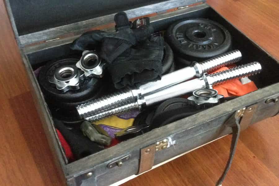 -Busca un lugar donde esconder tu gimnasio. Como muchos de nosotros vivimos en espacios reducidos, lo mejor es buscar los lugares en la casa donde tu set de pesas no estorben o rompan la armonía de tu hogar. Puedes buscar un baúl viejo o maleta donde guardar los discos de pesas y estas se pueden ver como parte de la decoración de tu casa. Un tip importante es colocarle ruedas a la caja que usarás ya que con el peso, te va a costar cargar todo el implemento.