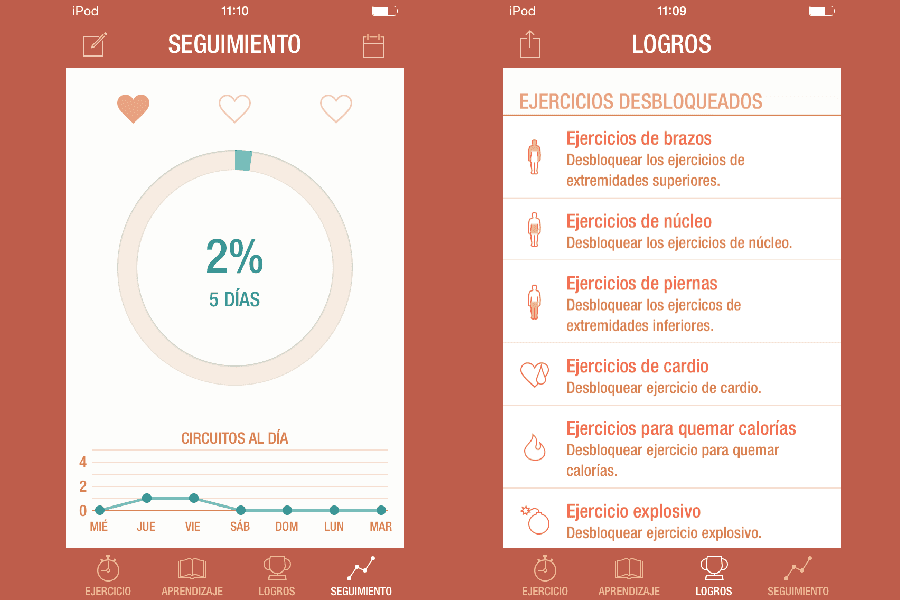 ¿Y cómo funciona el desafío? Como ya mencioné, el desafío consiste en hacer un circuito de ejercicios todos los días durante 7 meses. Si un día no haces los ejercicios, el entrenador te castiga reiniciando tu progreso, por lo que tienes que volver al día 1. Para evitarlo puedes pagarle rellenando corazones, los cuales se ganan mientras se progresa en la aplicación o se pueden comprar en ajustes. Este es el gran problema de la aplicación para mí: después de días cumpliendo con los ejercicios se me olvida hacerlos un día y ¡adiós progreso! Los corazones son difíciles de obtener así que me toca volver al principio, lo que encuentro muy poco motivador.